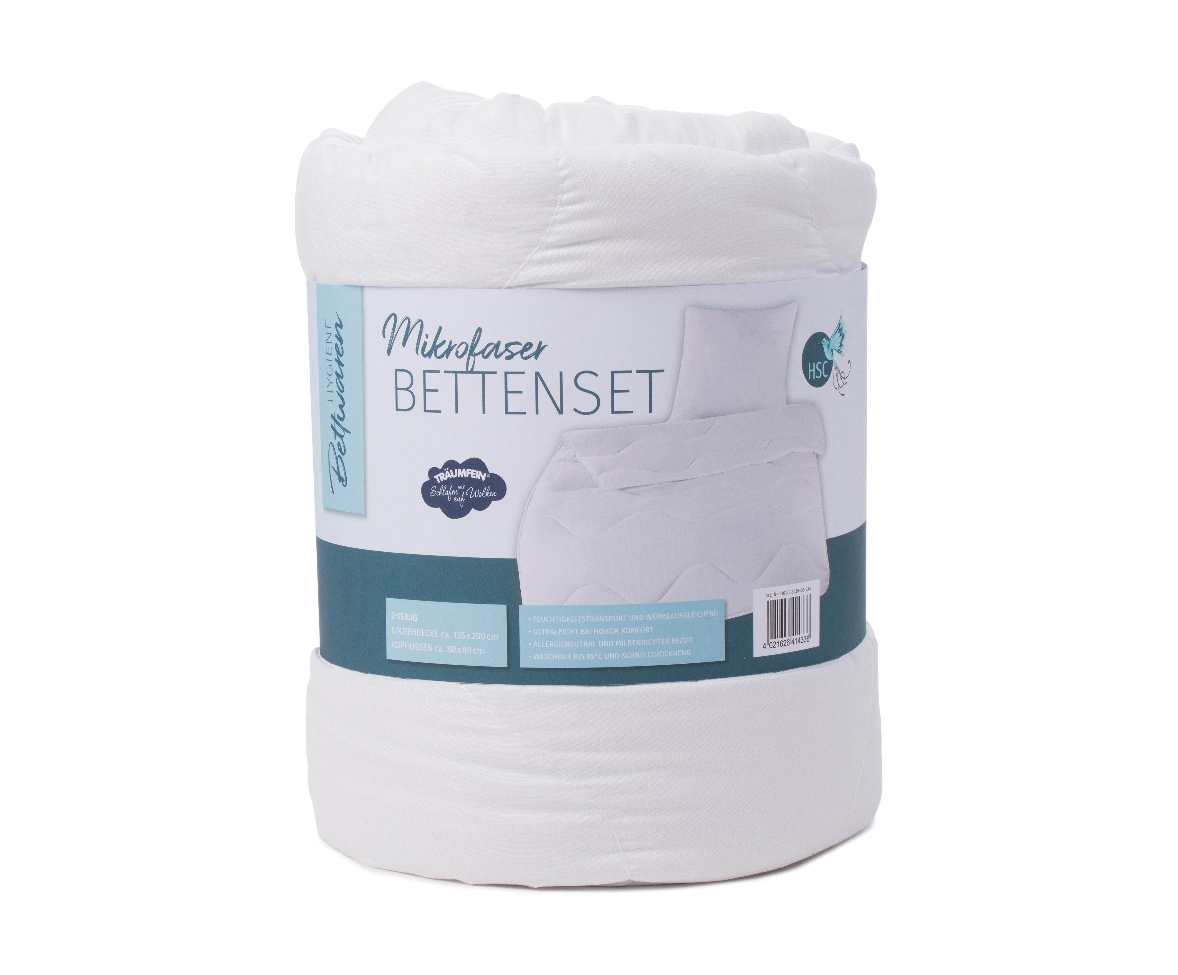 Bettenset 2-teilig bestehend aus Kopfkissen 80/ 80 cm mit ca. 900 g Füllung und Bettdecke 135/ 200 cm mit ca. 700 g Füllung, Bezug: 100% PES Mikrofaser, 72 g/ m², Füllung: 100% silikonisierte PES Hohlfaser, Bezug versteppt, kochecht, Aufmachung: Polyschutzverpackung, Öko-Tex Standard 100, Fb. 00 - weiß.