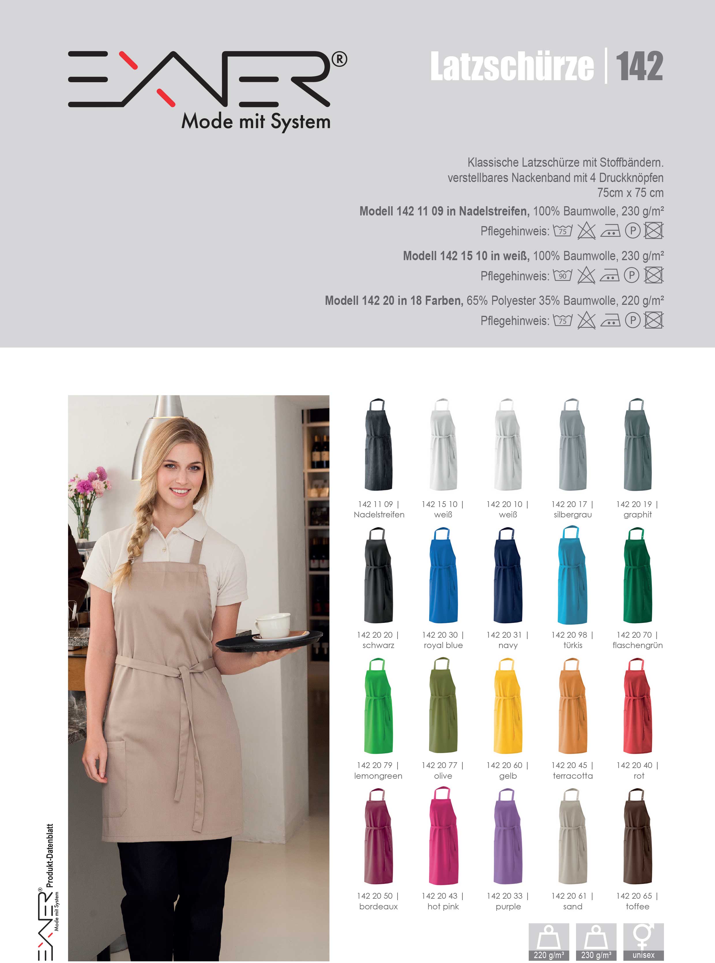 Überwurfschürze, unifarben, mit 2 aufgesetzten Seitentaschen (B 16 cm x H 17,5 cm), mit einem Stiftfach auf der rechten Seite, seitliche Laschen mit Druckknopfverschluss, Rückenlänge 83 cm bei Grösse 1 (36 bis 42), 65% Polyester, 35% Baumwolle, Grammatur: ca. 220 g/ m², in zwei Konfektionsgrößen: Gr. 1 (36 bis 42) und Gr. 2 (42 bis 52), in 14 Farben.