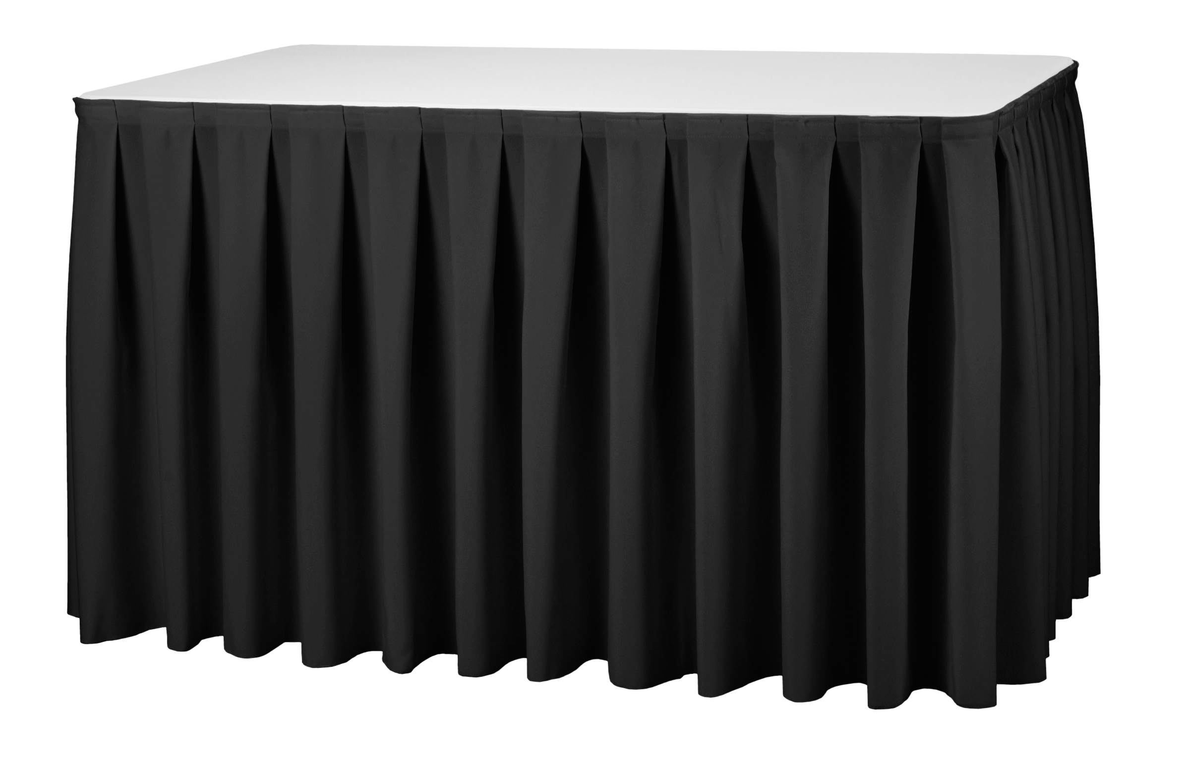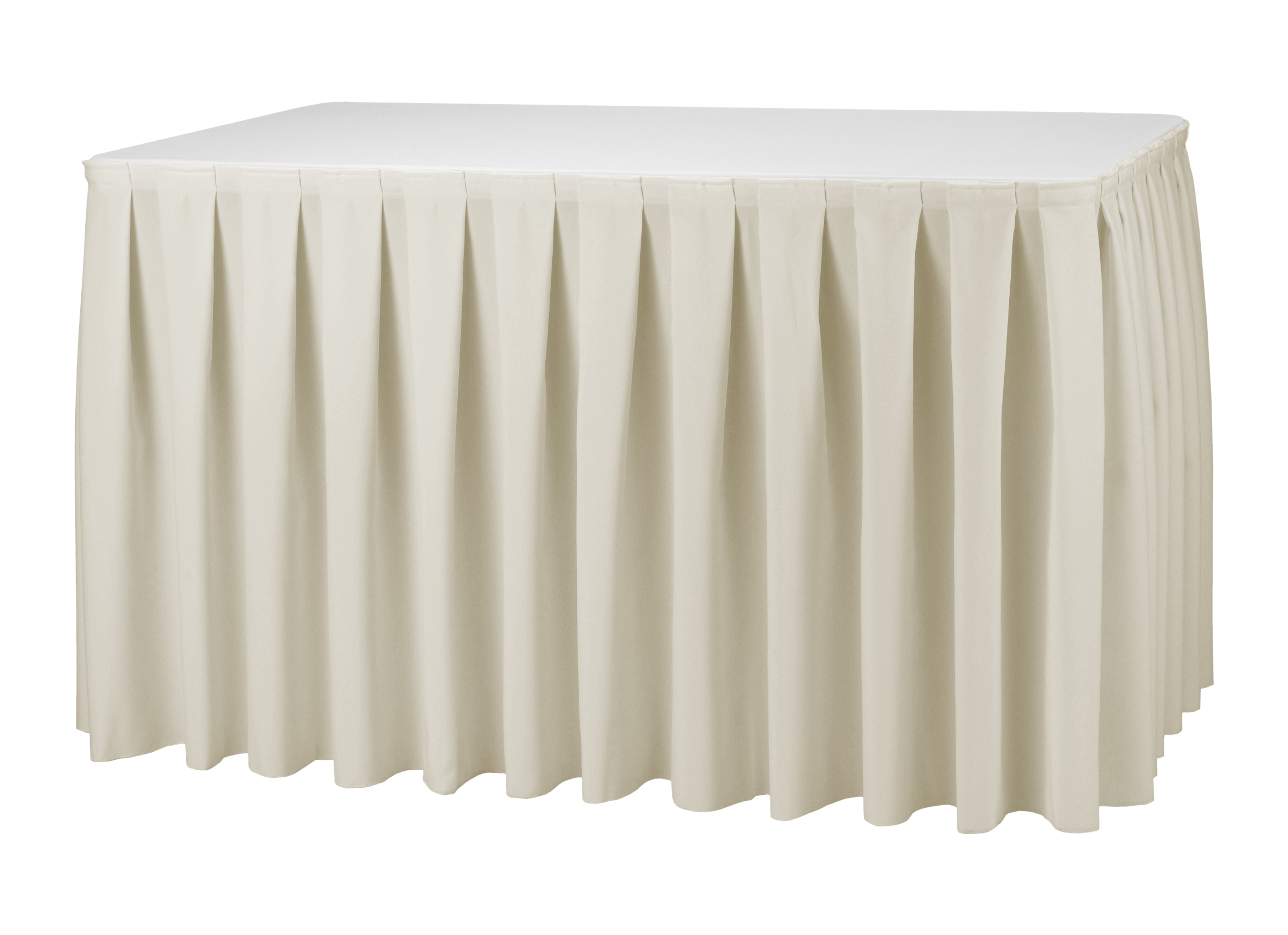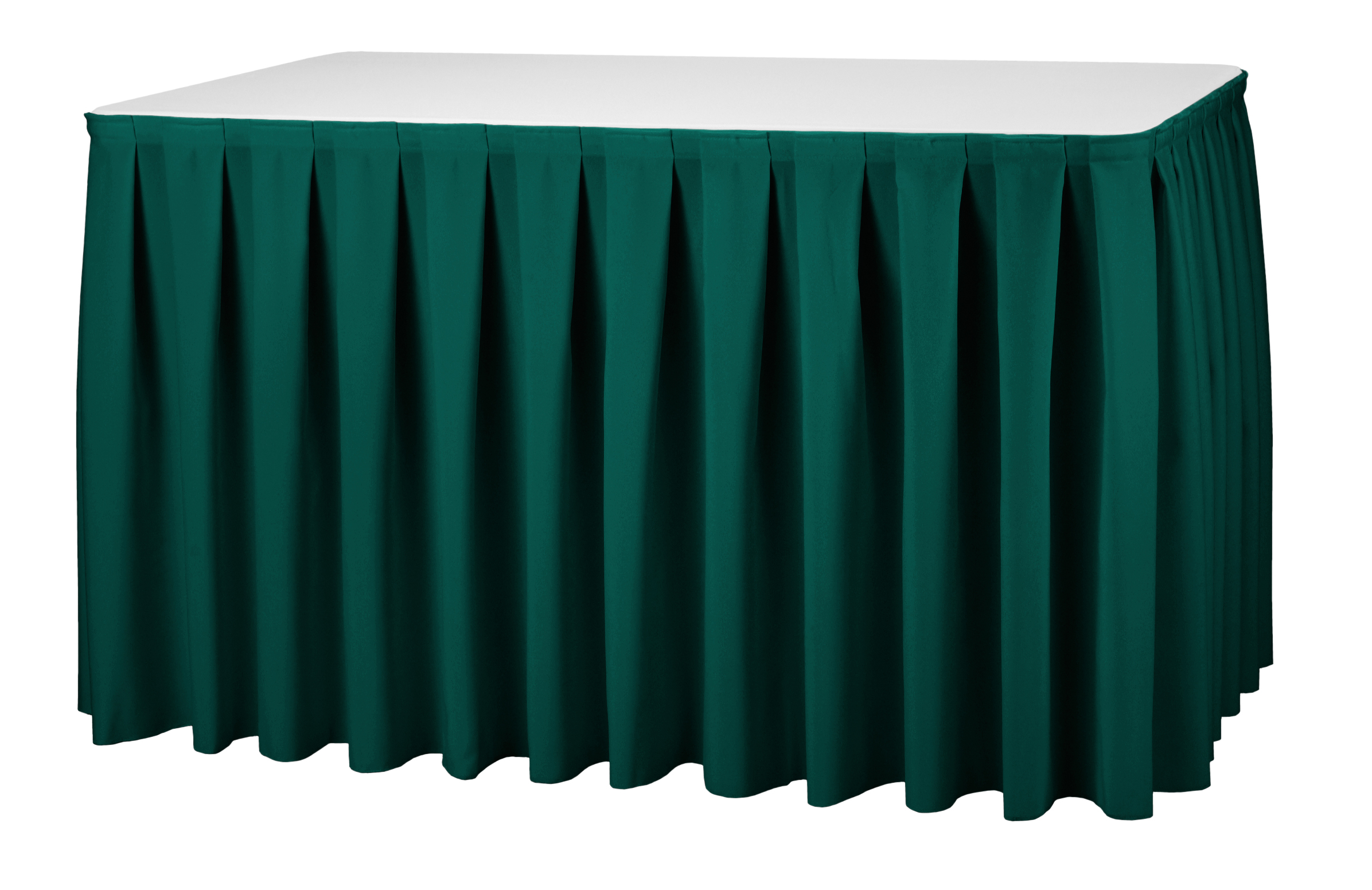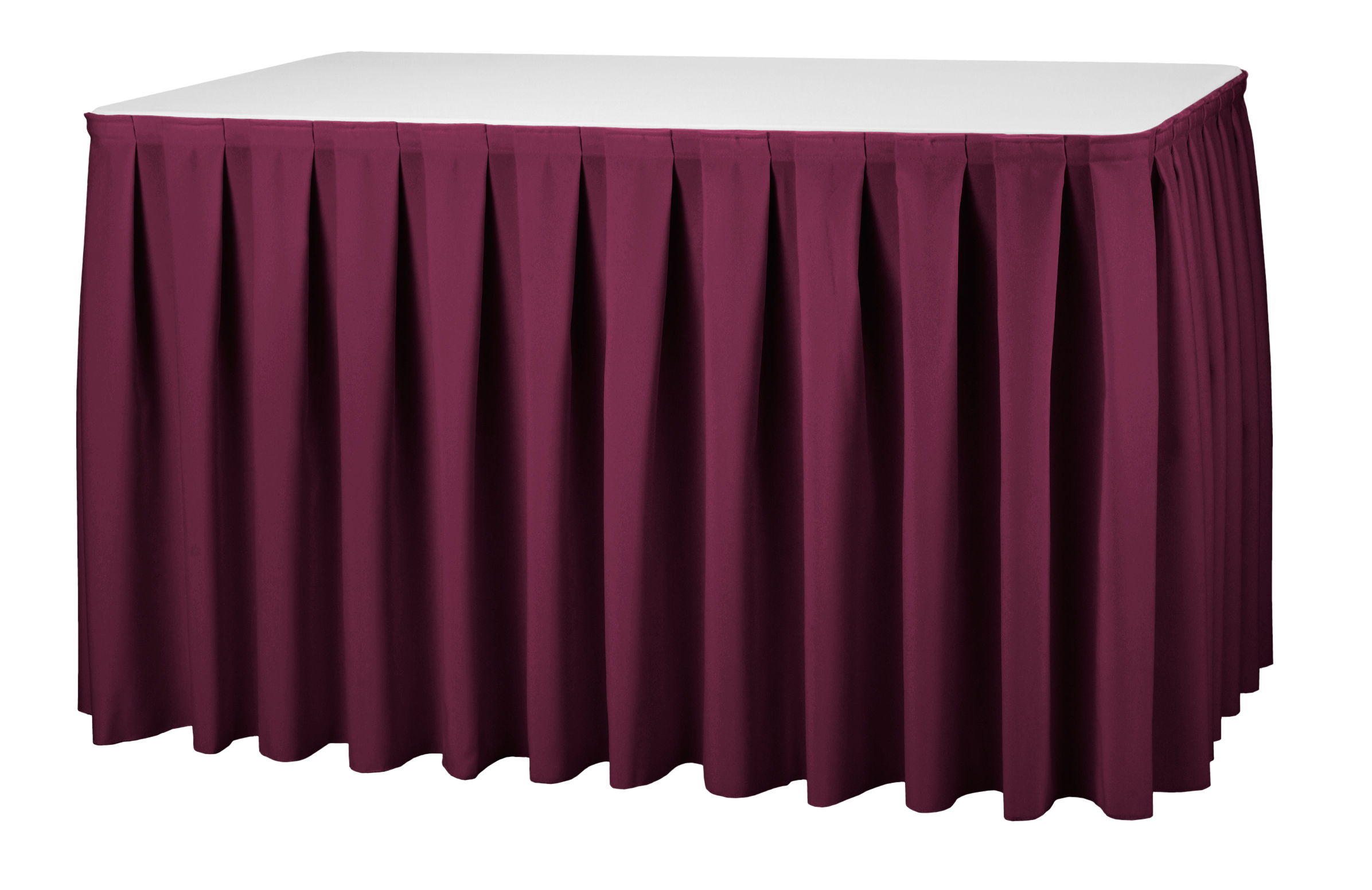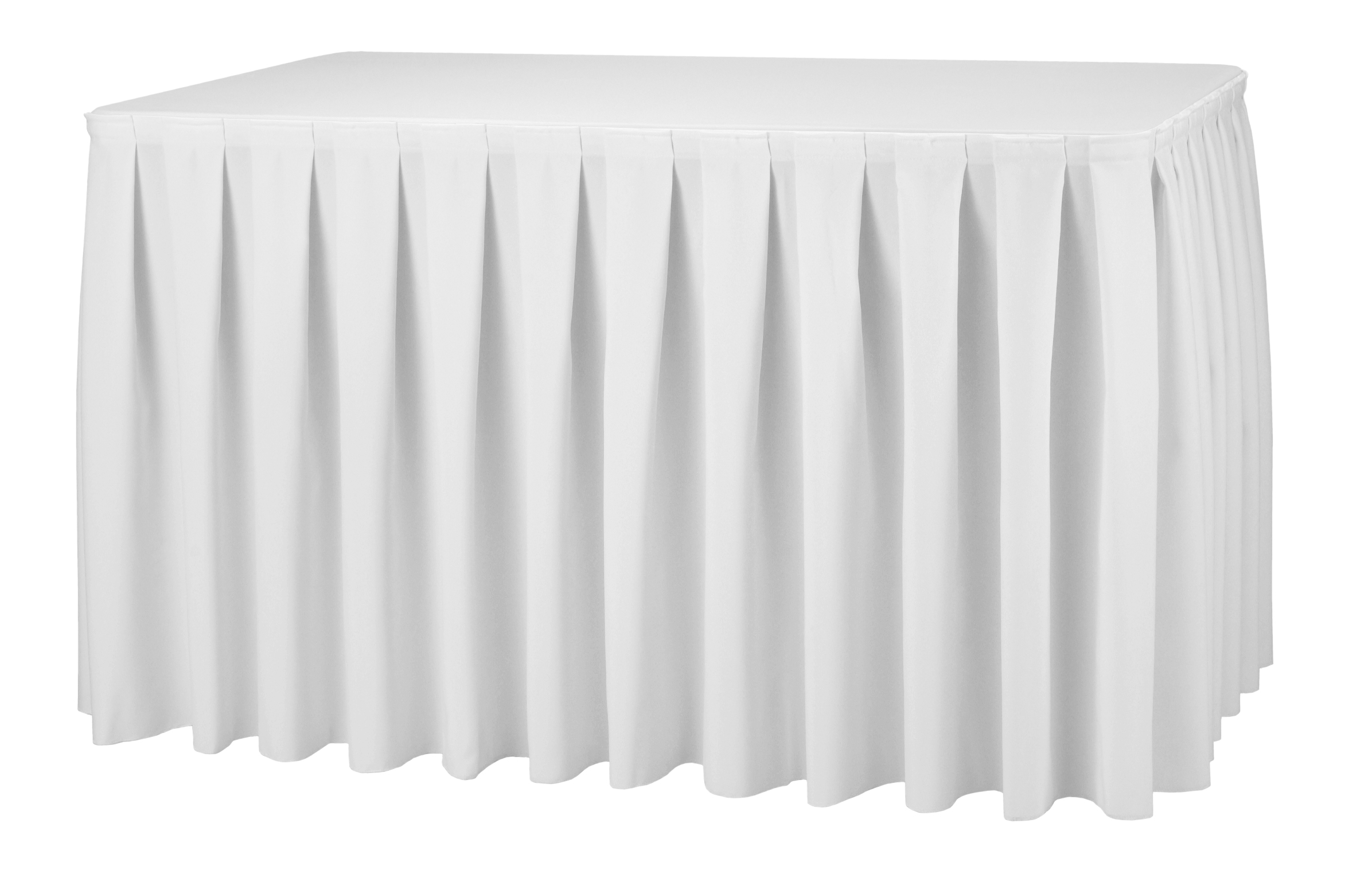 Standardskirting mit Boxpleatfalte (250%), aus 100% Polyester, farblich abgestimmtes Flauschband, 4 cm breit, gekettelter Saum, mit Skirtingbügel, bei 40° C waschbar, pflegeleicht, bügelfrei für Tische mit einer Höhe von 73 cm sowie einer Länge von 410 cm oder 580 cm, in 6 Farben.