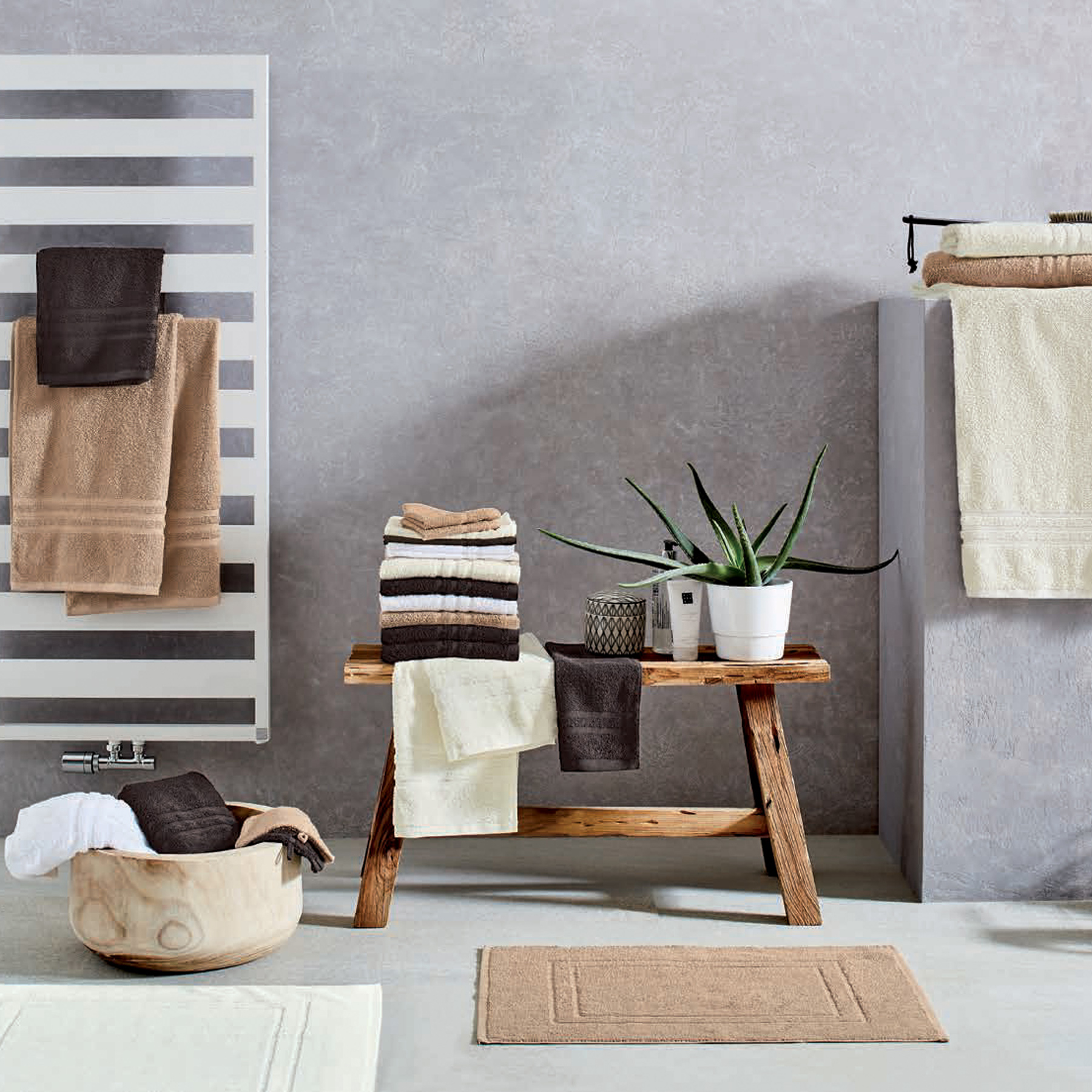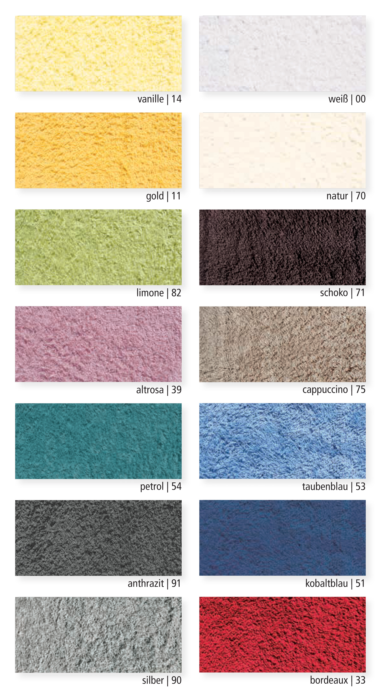Uni-Walkfrottier mit eleganter 3-Streifen-Webbordüre, wobei 16/21 cm und 30/ 30 cm mit 1 Streifen sowie 30/ 50 cm mit 2 Streifen versehen sind, 4-seitig gesäumt, in 14 Farben.