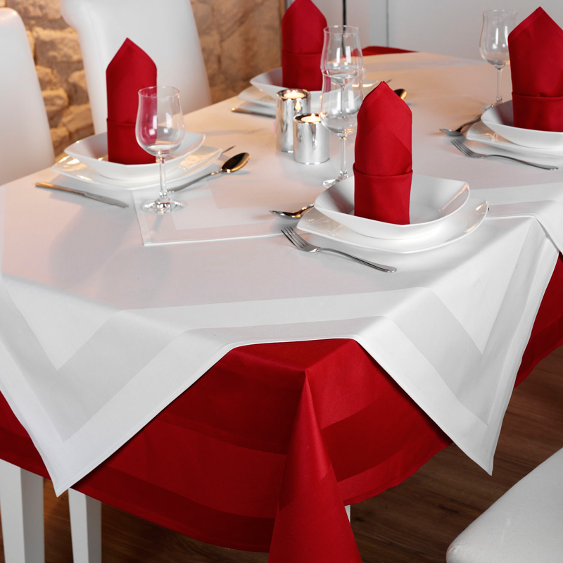Vollzwirn-Damast Tischdecke mit 4-seitiger Atlaskante, 2-seitig gesäumt, koch- und chlorecht, mit optischem Aufheller vorbehandelt.