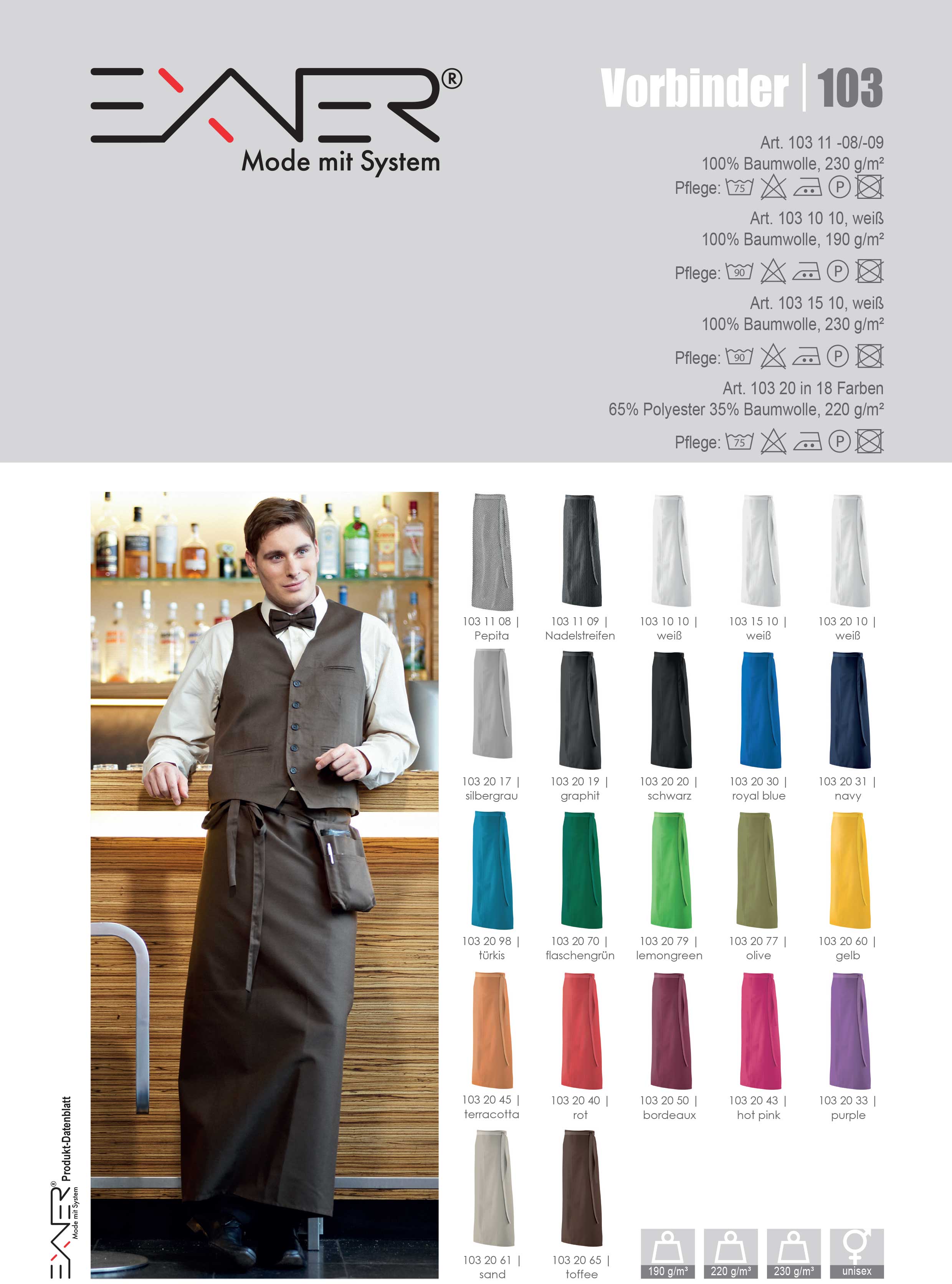 Vorbinder, unifarben, mit durchgehenden Stoffbändern, 65% Polyester, 35% Baumwolle, Grammatur: ca. 220 g/ m², Breite x Länge: 90 x 60 cm, in 18 Farben.