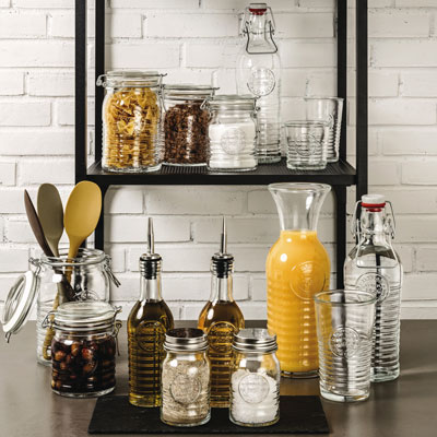 Das Becher- und das Longdrinkglas der Serie OFFICINA 1825 von BORMIOLI ist charmant verspielt und auch rustikal aufgrund des geprägten Stempels und den strukturierten Ringen. Ergänzt wird diese Trinkgläser Kollektion mit einer Glasflasche mit einem praktischen Bügelverschluss sowie einer schicken Karaffe mit Stopfen.