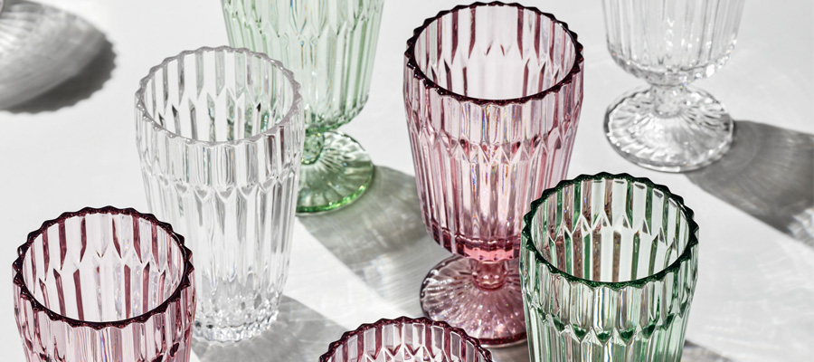 Archie v. Fortessa mischt Farbe und Licht mit einer strukturierten Form. Durch die geformte Facette liegen die Gläser gut in der Hand. Das solide Gewicht und die strapazierfähige Glasrezeptur (Natron-Kalk-Silikat) gibt ein deutliches Statement ab. Die Facette bricht zudem das Licht und lässt ein interessantes Schattenspiel entstehen. Klassisch in klar oder alternativ in den frischen Farben salbeigrün und pink, lässt eine moderne Tischlandschaft gestalten.