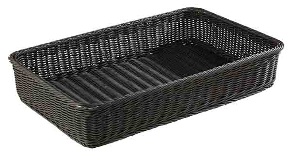 GN 1/1 Korb 53 x 32,5 cm, H: 10 cmPolypropylen, schwarz mit Edelstahldraht im RandPROFI LINE = S7 = Polypropylen E2 = spülmaschinengeeignet E4 = bruchsicher E5 = stapelbar E10 = GN System E21 = GN 1/1 F2 = Farbe: Schwarz