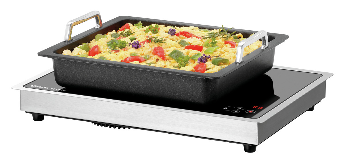 Extra flache Warmhalteplatte für Buffet, Catering und Front-Cooking. Die Speisen werden warmgehalten und formschön für die Speisenausgabe präsentiert. Perfekt geeignet für Behältnisse im 1/1 GN-Format.