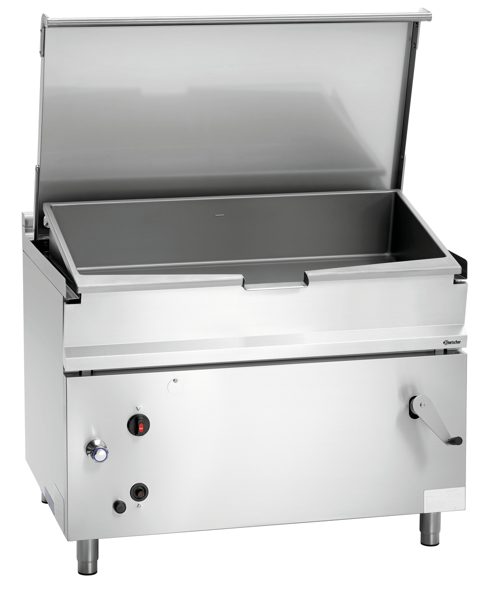 Kippbratpfanne der Serie 900 in bekannter hochwertiger Edelstahl-Ausführung. Der Tiegel ist vollständig aus Edelstahl und fasst bis zu 70 Liter. Das Elektro-Modell mit manueller Kippvorrichtung verfügt über einen Wassereinlaufhahn und ist ausgelegt für einen Kalt- oder Warmwasseranschluss.