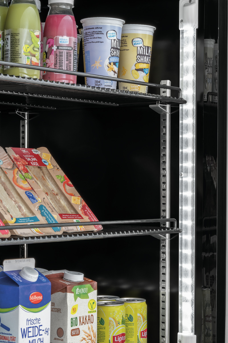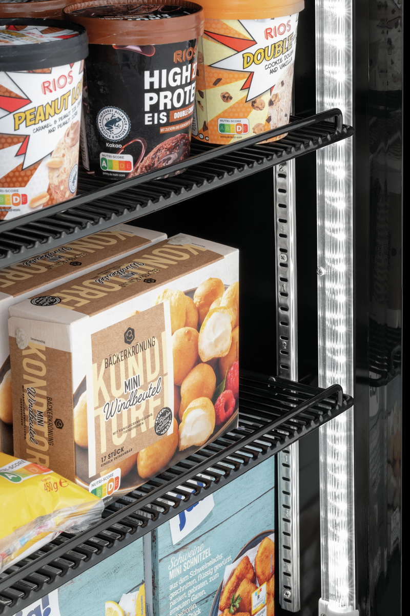 Darf es etwas mehr sein? Der doppeltürige Tiefkühlschrank bietet mit seinen Zwischenablagen im 2/1 GN-Format ein besonders großes Platzangebot für die Lagerung von Tiefkühlwaren. Die leistungsstarke Umluftkühlung trotzt der Größe und sorgt im Innenraum für eine gleichmäßige und konstante Temperatur.