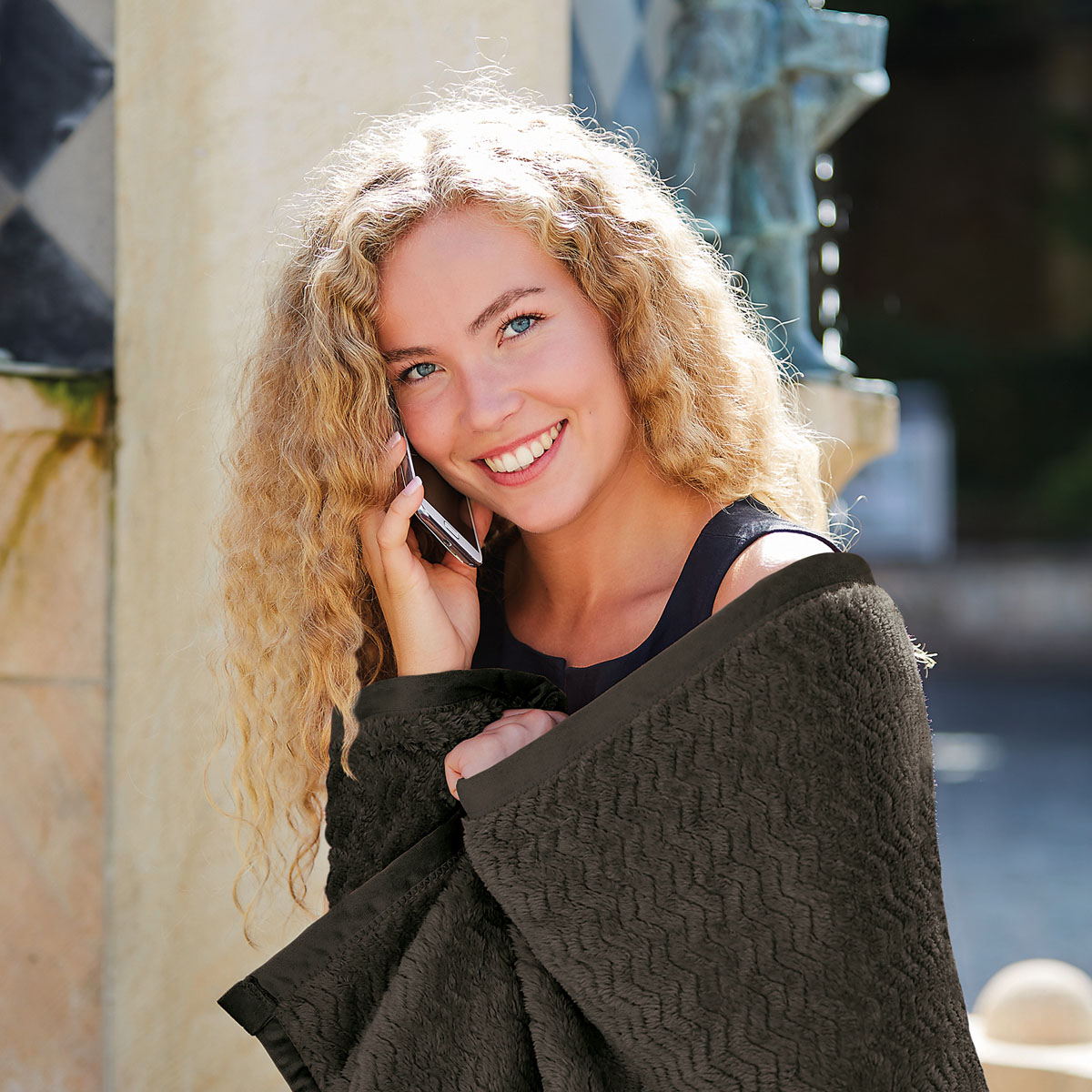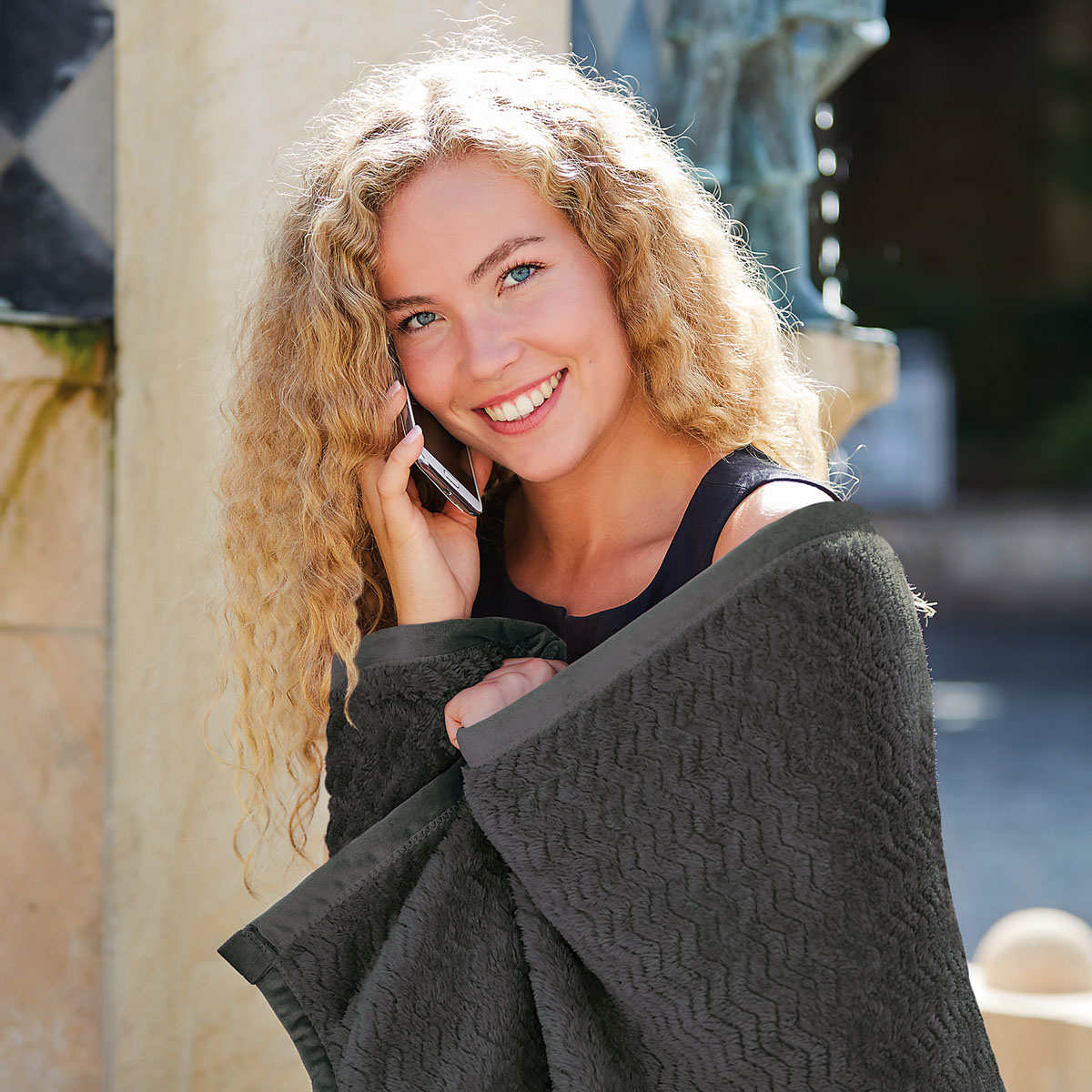 Flauschige Mikrofaserdecke MEMPHIS-STOLA, unifarben, mit samtweichem Einfassband veredelt, einzeln mit Banderole aufgemacht. Kuschelig weich und angenehm wärmend, für In- und Outdoor, pflegeleicht, dunkle Farben bitte separat waschen, in 8 Farben.