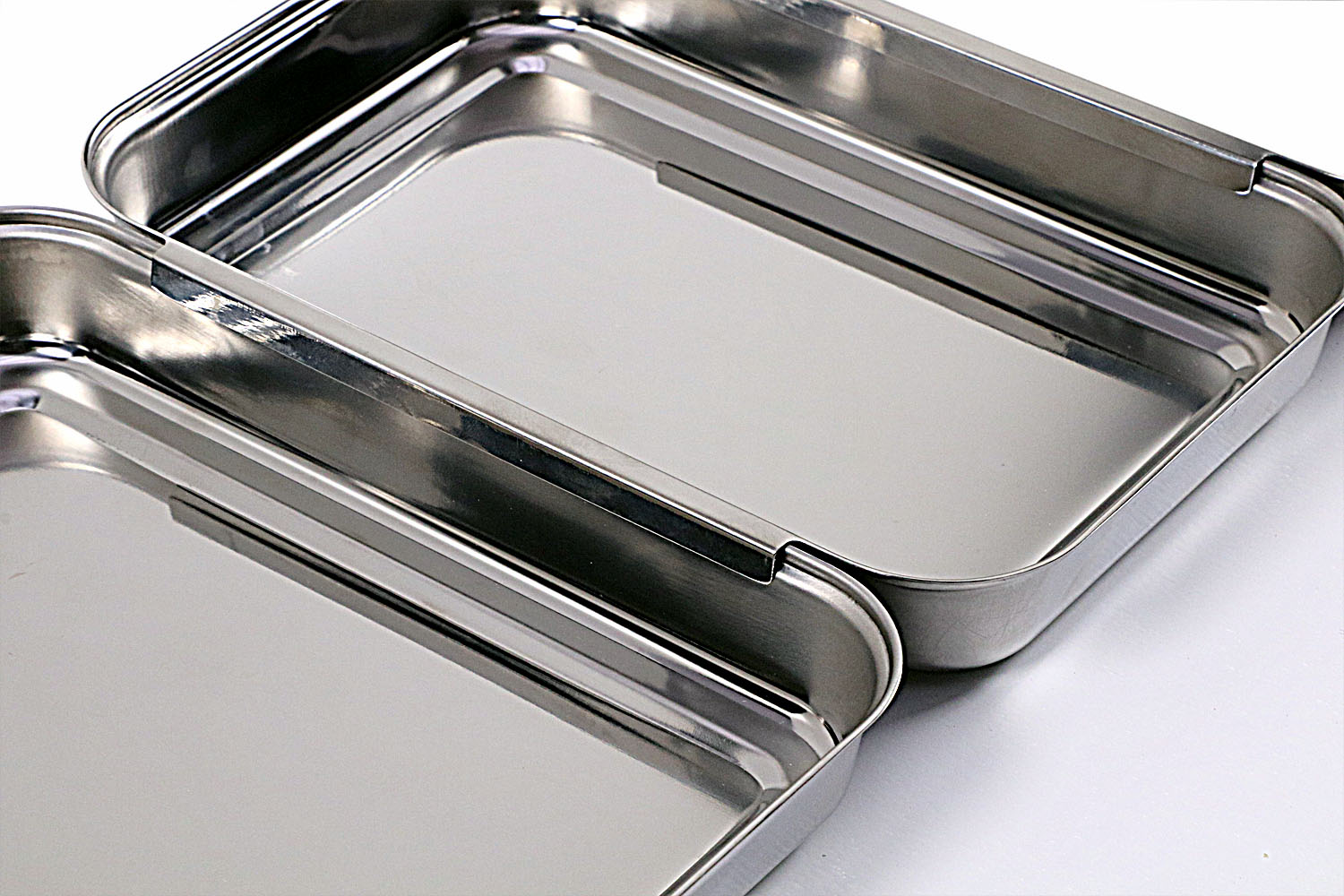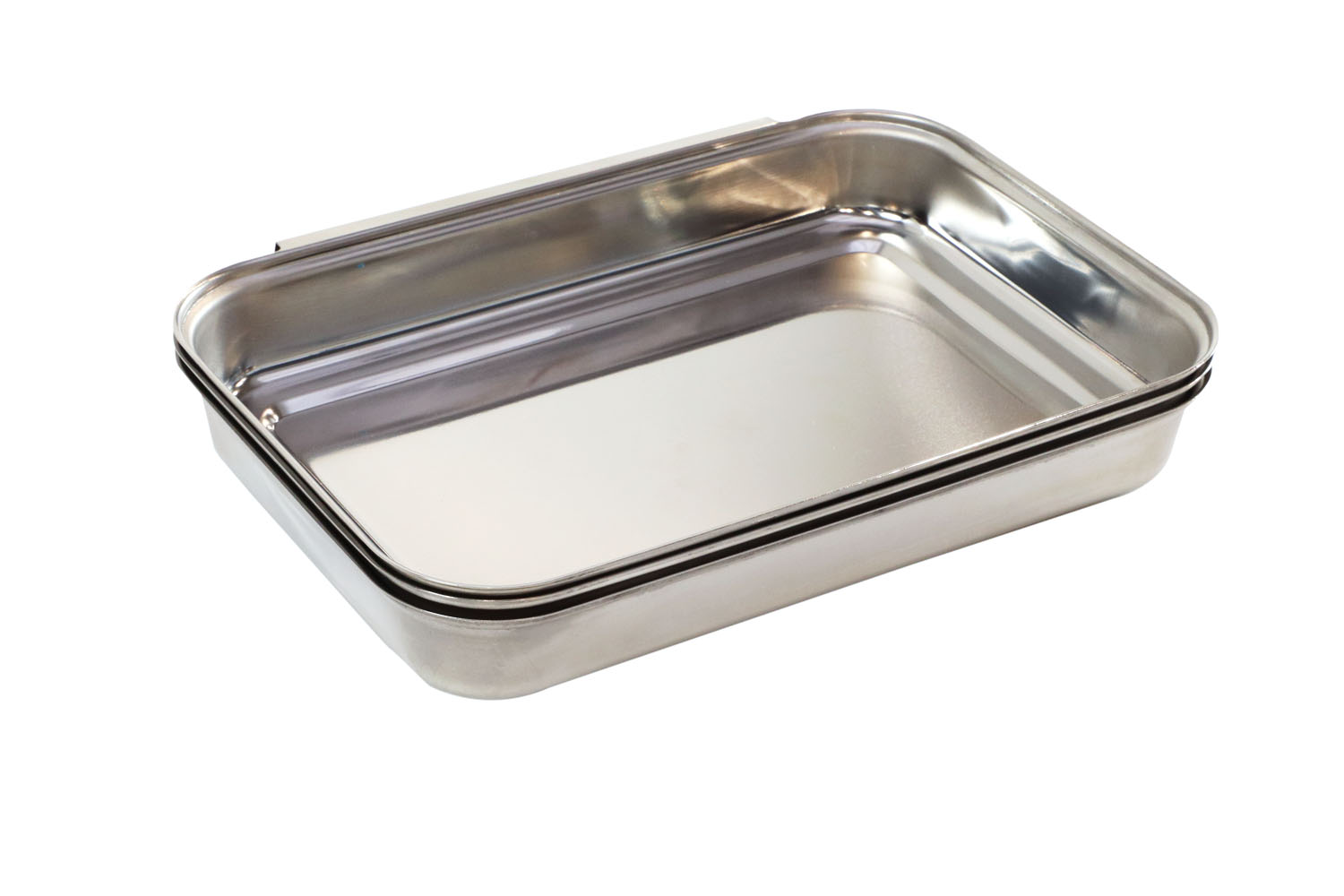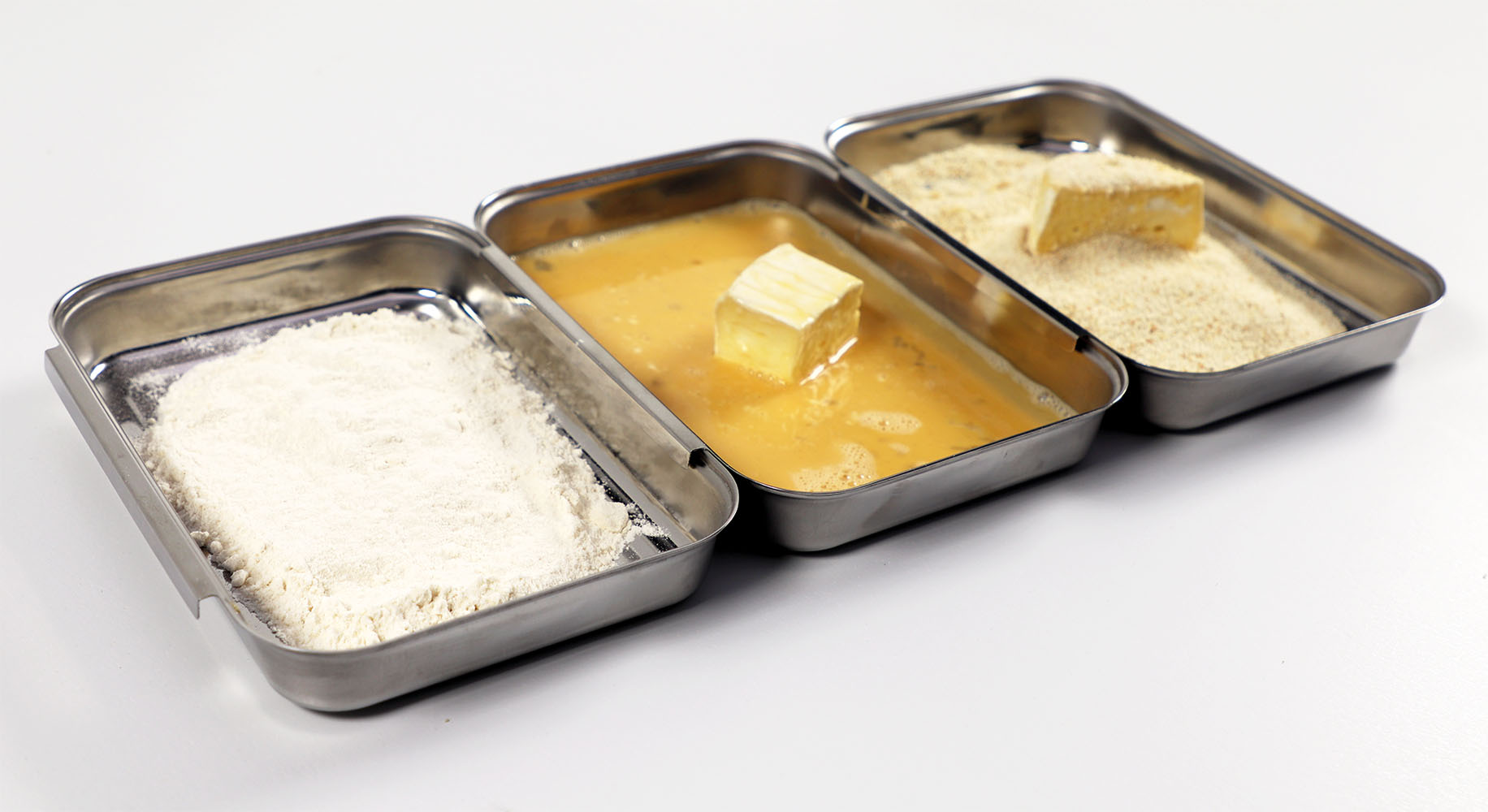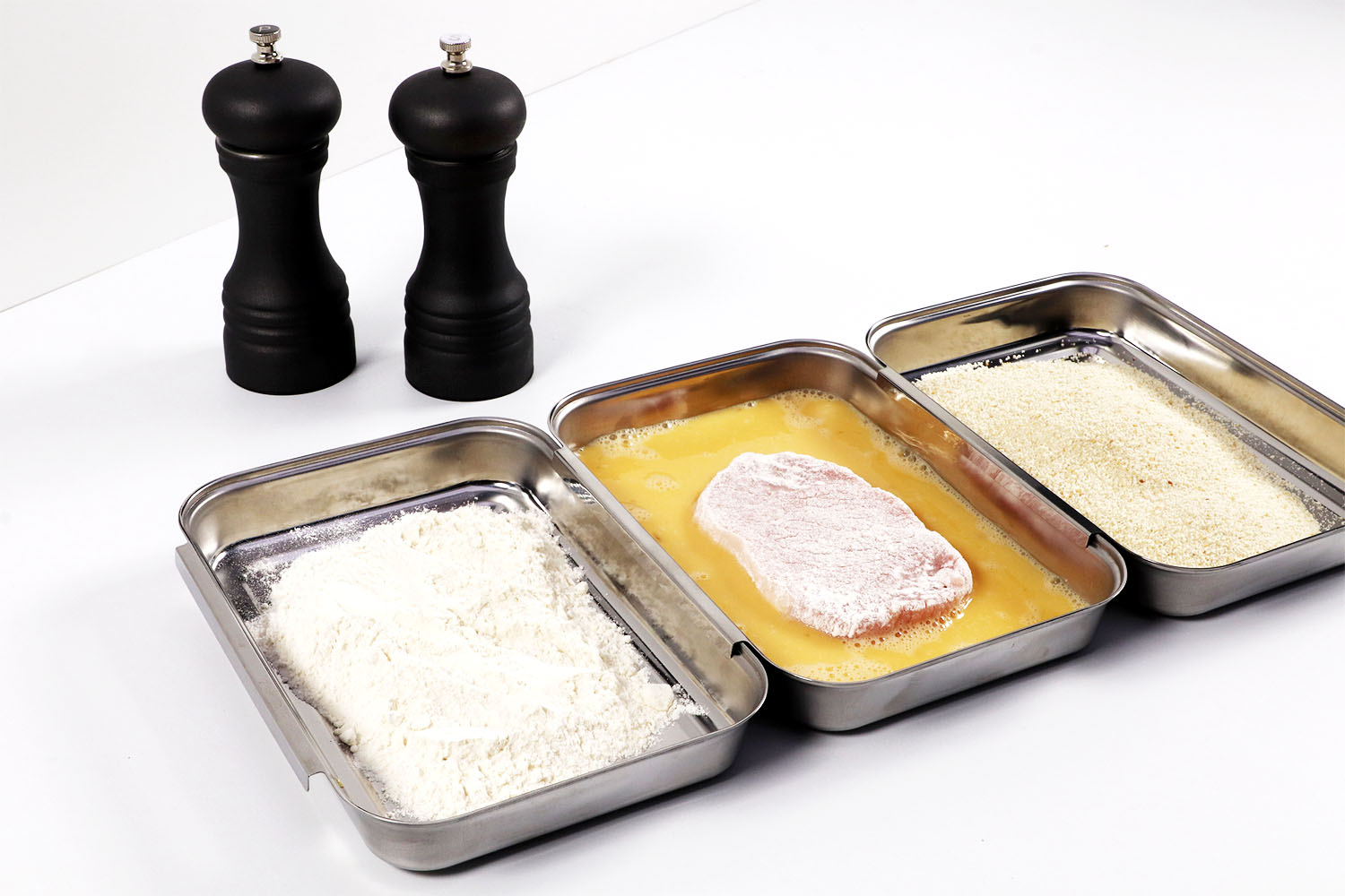 Produktinformationen "Panierstation, 3-teilig, 45,5 x 18 x 2,5 cm, 18/0 Edelstahl, poliert, mit 3 Schalen je 18 x 15,5 x 2,5 cm"