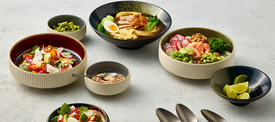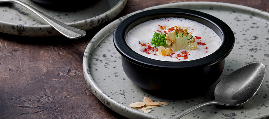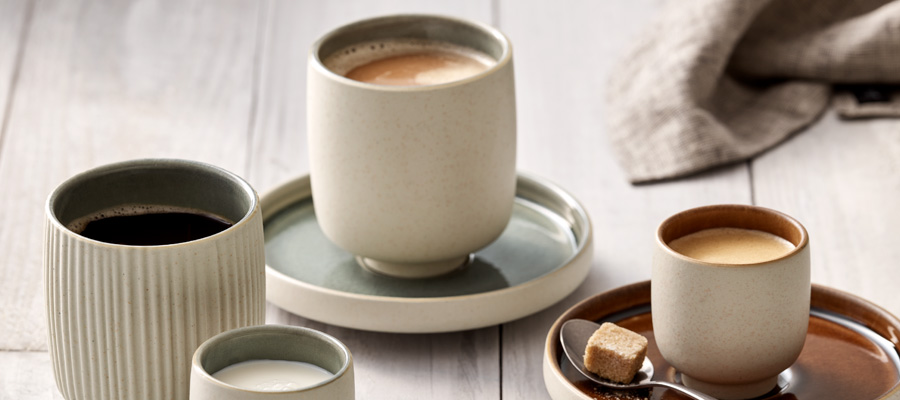 Tipp: Besonders beliebt ist die Steinzeug-Kollektion NARA. Entworfen für die ambitionierte Gastronomie ist sie hervorragend verarbeitet und bietet einen reizvollen Kontrast zwischen glatten Innenflächen und stark strukturierten Außenfläche. Beinahe unsichtbar sorgen die filigranen Standfüße der Artikel einen schwebenden Effekt – ideal für luftige Kreationen und Genussexperimente. Damit bieten die patinaartigen Craquelé-Glasuren in Erdtönen und mattem Schwarz sowie die glatte oder reliefierte Ausführung der Außenwandung unendliche Kombinationsmöglichkeiten für ansprechende Speisenpräsentationen.
