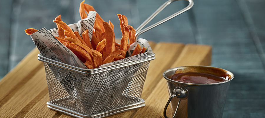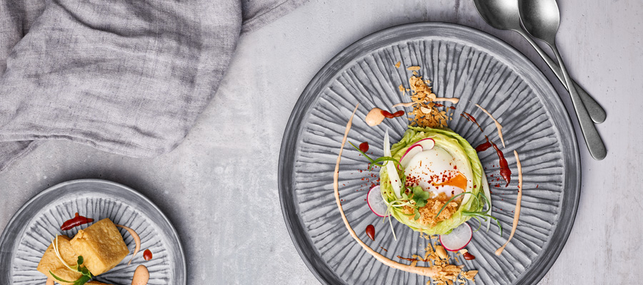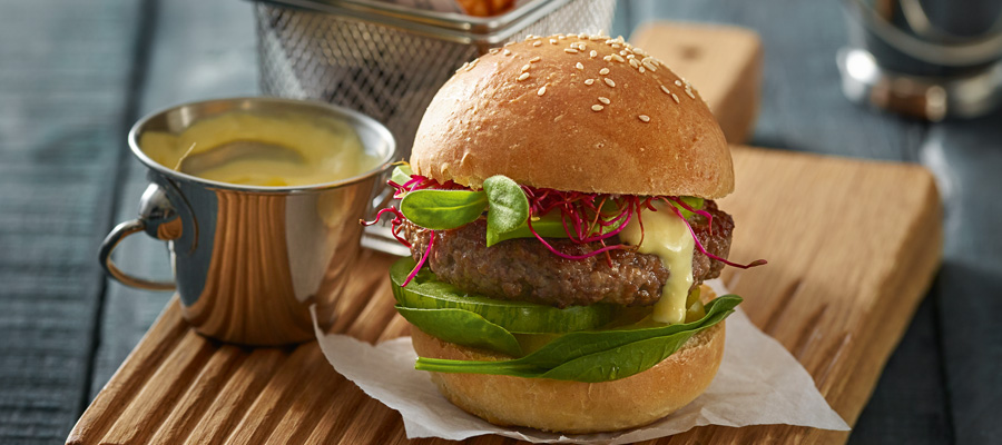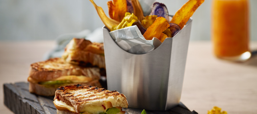 Knusprige Panini, gereicht auf einem Holzbrett im Farbton von Mooreichen. Aus massiver russischer Eiche, mit Kettensäge bearbeitet und eingelassen mit Leinöl. Gemüsechips als Beilage mal anders präsentiert: in einer -Pommestüte aus Edelstahl. Mit den Produkten aus Edelstahl von Playground haben Sie viele Möglichkeiten für die kreative Darbietung Ihrer Speisen.