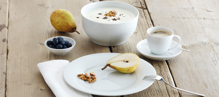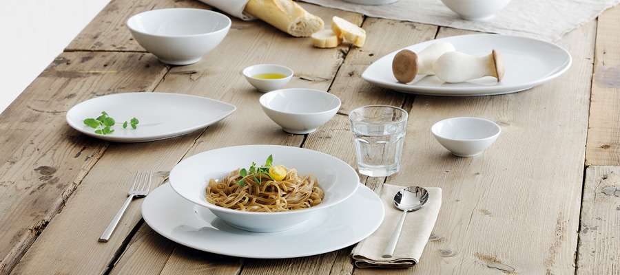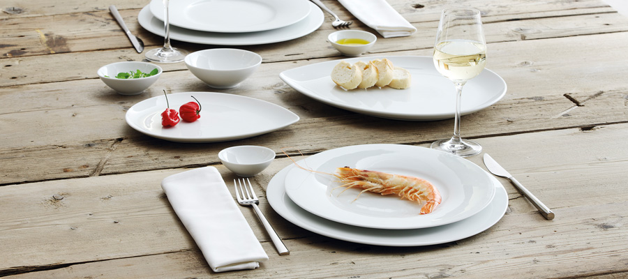 Feine Zutaten für eine einladende Tafel. DÎNER von KAHLA ist ein Fest der runden Formen. Die Teller mit großzügigen, gewölbten Fahnen machen auch kleine Portionen ganz groß. Porzellan in eleganten Dimensionen und delikater Wandstärke schafft Raum für den eigentlichen Star: das Essen.
