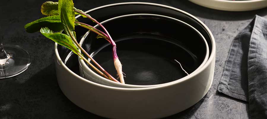 Nyx von Steelite bietet ein kontrastreiches schwarzes Dekor, dass die Farbtöne der vom Koch kreierten Speisen unterstützt und hervorhebt. Dies fesselt das Auge des Gastes und verleiht der Präsentation Dynamik und Dramatik. Das randlose Profil der Geschirrartikel bietet den Köchen die ultimative Fläche zum Anrichten, so dass ihr Können und ihre Kreativität bestmöglich zur Geltung kommen. Nyx von Steelite strahlt Eleganz und Klasse aus und verfügt über eine dauerhafte Haltbarkeit und ermöglicht es, immer wieder unvergessliche Erlebnisse zu schaffen. In Kombination mit Asteria von Steelite, der Göttin der Sterne, bilden diese beiden Porzellankollektionen ein interessantes Ensemble aus Dunkelheit & Licht.
