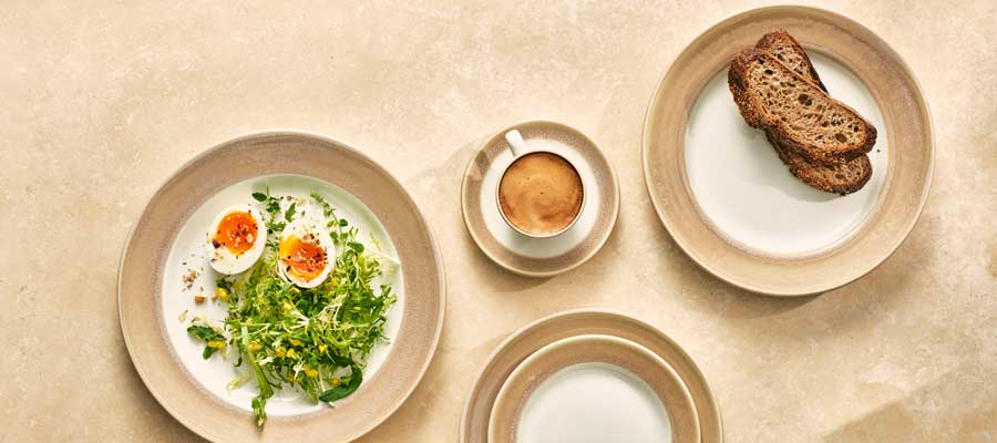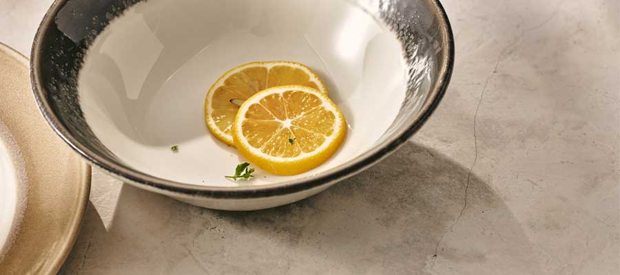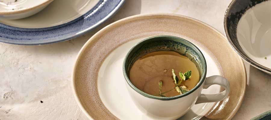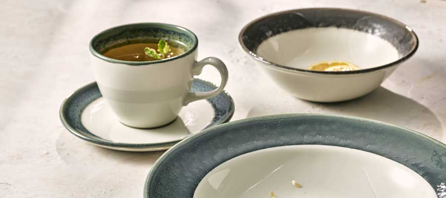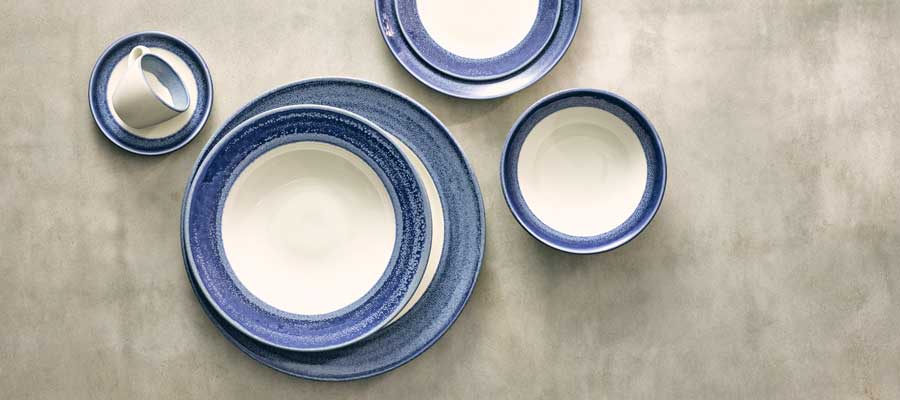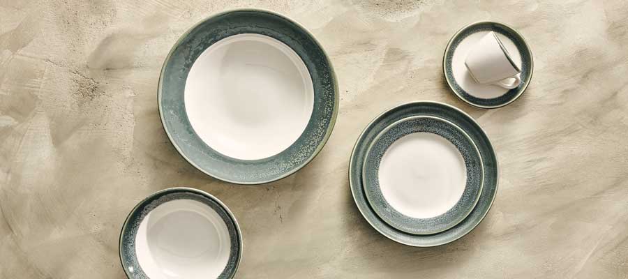 Revolution Edge v. Steelite ermöglicht die Präsentation von Speisen auf einer sauberen weißen Plattform, die durch ein kontrastreiches Farbfeld ergänzt wird. Dies hat den Effekt, dass die Kreativität des Kochs hervorgehoben wird und die Speisen für sich selbst sprechen. Die Verwendung von handaufgetragenen reaktiven Glasuren auf Revolution Edge rahmt die Speisen wunderschön ein. Revolution Edge v. Steelite kann als einfarbige Präsentation verwendet oder beliebig mit den vier anderen Farben aus dem Sortiment gemischt und kombiniert werden (Mix & Match). Es lässt sich auch wunderbar mit Revolution kombinieren.