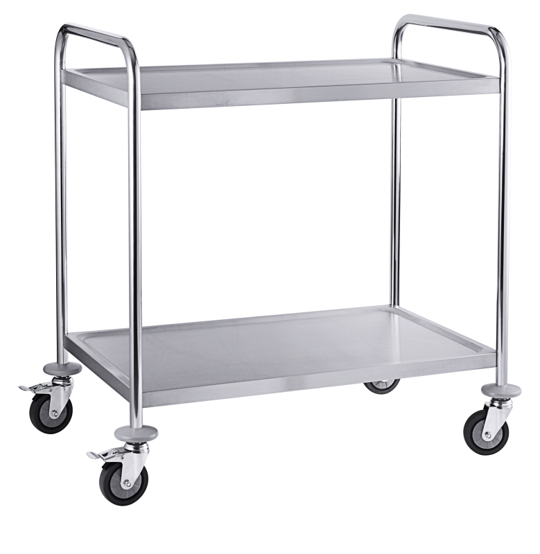Servierwagen aus Edelstahl 18/0, Ø 25 mm Rohrdurchmesser, Montage mit festsitzendem rostfreien Bolzen M12, 0,8 mm starke Ablagefläche, innen 76 x 44 cm, außen 83 x 51 cm, auf Unterseite schalldämmend beschichtet, 4 Lenkrollen Ø 125 mm, davon 2 feststellbar, Traglast 40 kg je Ebene