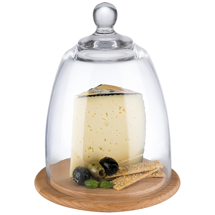 Tablett mit Haube D: 18,5 cm, H: 24 cm Glas, Buchenholz Set bestehend aus: Tablett aus Buchenholz, D: 18,5 cm, H: 2,5 cm Haube aus Glas, D: 16 cm, H: 22,5 cm