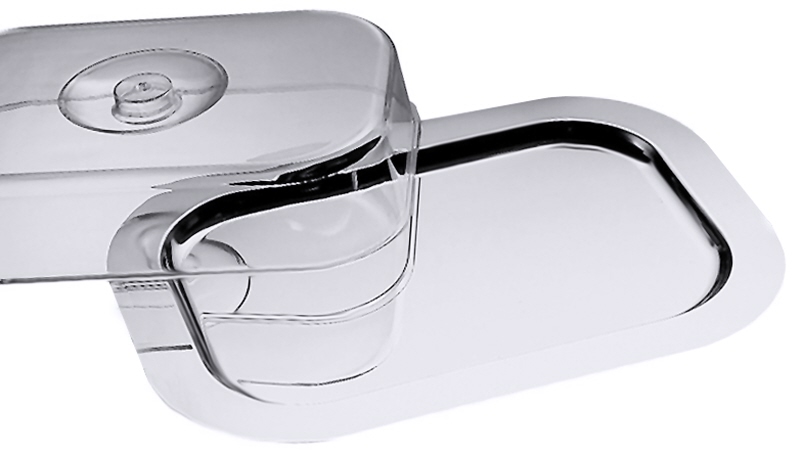 Tablett mit Haube 25 x 19 cm, Haubenhöhe 7 cm Tablett: 18/0 Edelstahl Haube: Polystyrol A3 = Made in Germany S4 = PolystyrolM2 = Edelstahl 18/0 E2 = spülmaschinengeeignet E5 = stapelbar F3 = Farbe: Edelstahl