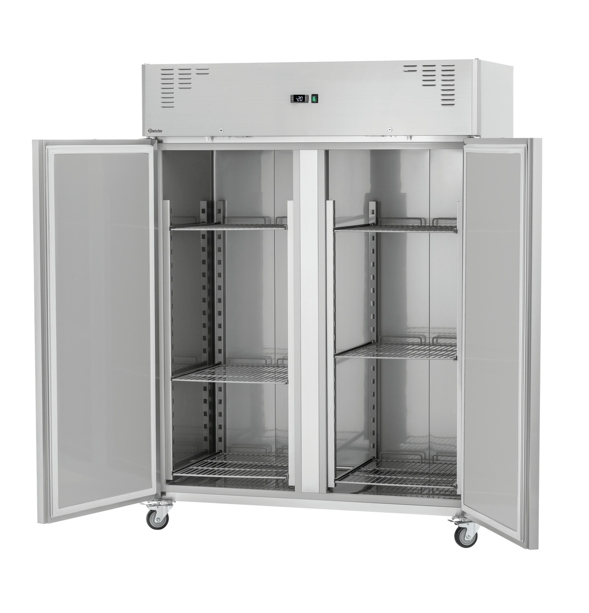 Dank des großzügigen Platzangebots lässt sich Tiefkühlware auf den höhenverstellbaren Rosten im 2/1 GN-Format übersichtlich lagern und bevorraten. Die leistungsstarke Umluftkühlung des Edelstahl-Tiefkühlschranks trotzt der Größe und sorgt im Innenraum für eine gleichmäßige und konstante Temperatur.