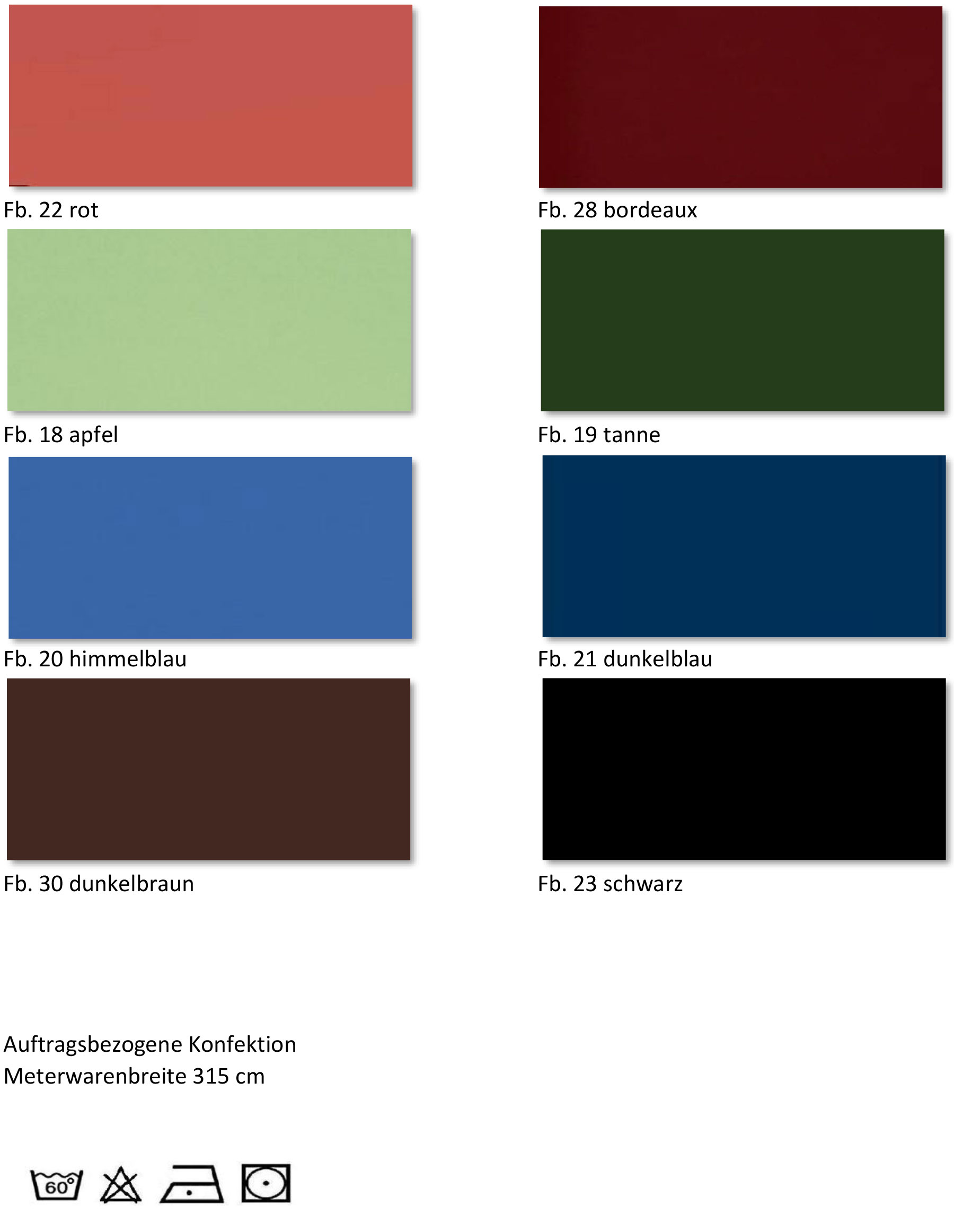 Mischgewerbe, unifarben, ohne Dessin, in 20 Pastell-, Voll- und Intensivfarben, indanthrengefärbt, Einlauf ca. 5% Kette und 3% Schuss, ca. Maße nach der Wäsche.