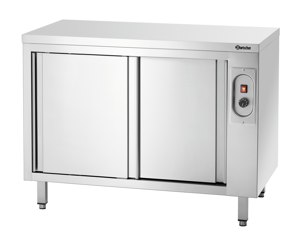 Der Wärmeschrank mit einer Breite von 1,8 Metern bietet einen stufenlos regulierbaren, beheizten Stauraum mit beidseitiger Bedienung. Mit der robusten Oberfläche aus Edelstahl integriert sich gleichzeitig ein solides Arbeitselement in die Küche.